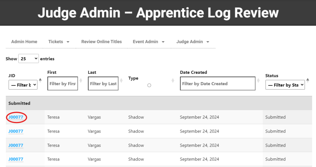 To review an individual log, click the JID (Judge ID). You may filter results as needed.