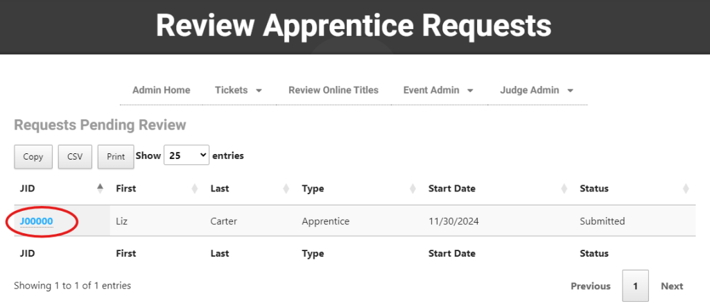 The requests requiring review are displayed first. To review, click the JID (Judge ID):