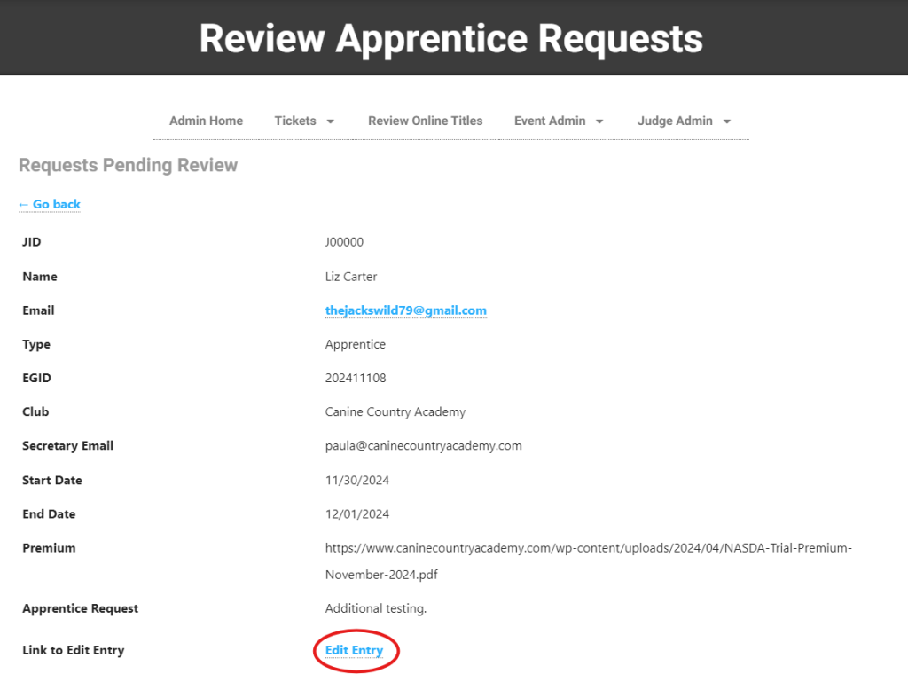 The details of the request will display. To add notes and approve or decline the assignment click “Edit Entry.”