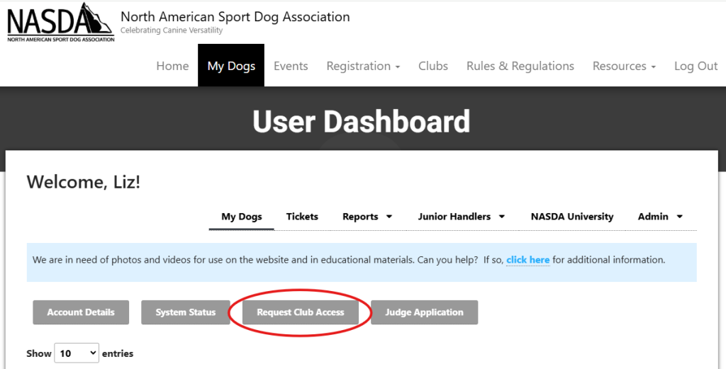 Click “Request Club Access” from the “My Dogs” screen.