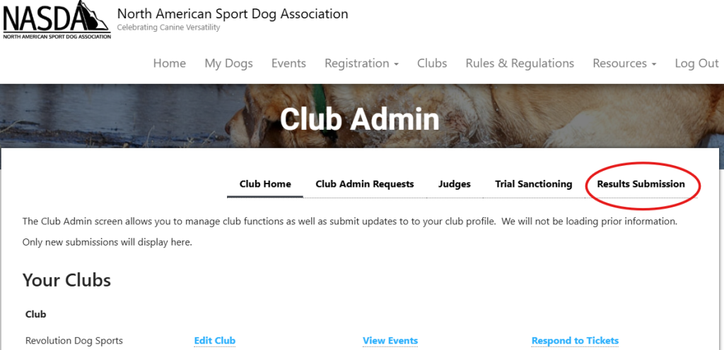 From the “My Dogs” page select “Club Admin” from the Admin menu.
