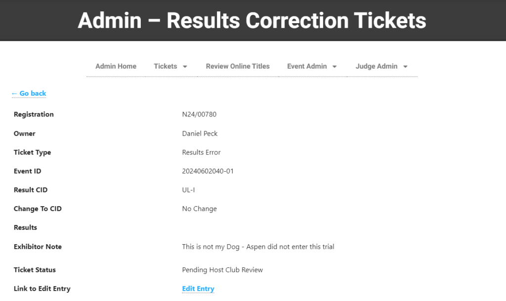 In the example shown below, an exhibitor is submitting a ticket because their dog’s registration number was recorded incorrectly in trial secretary software and as a result their dog’s results are being posted to another dog.
