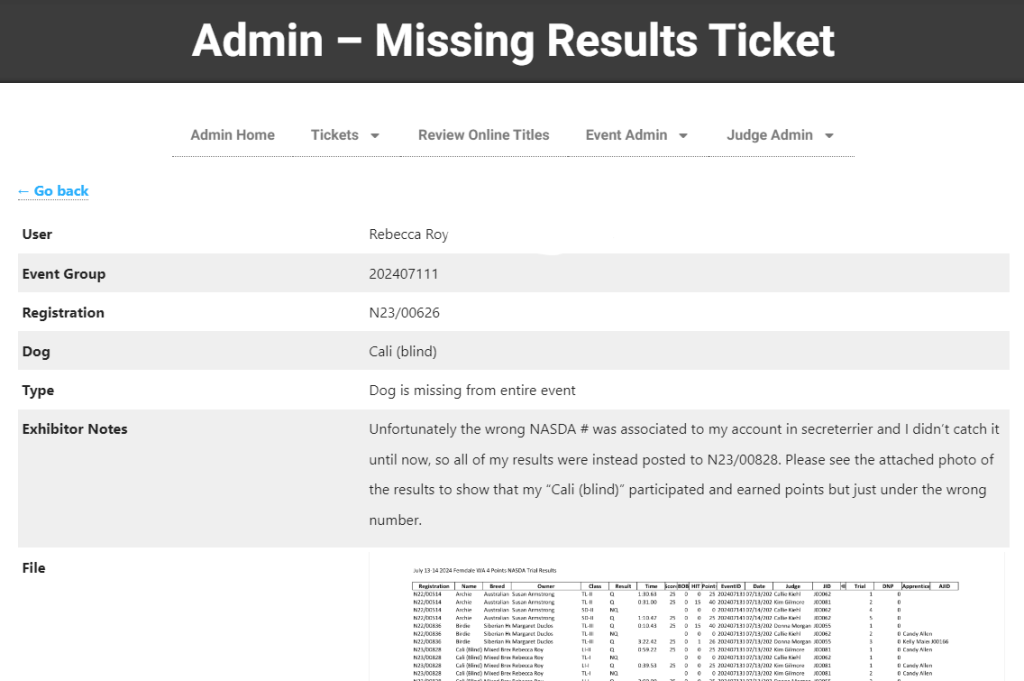 Below is an example of a ticket submitted by an exhibitor. In this case, the exhibitor is reporting that this dog did not compete in this event. NASDA admin confirmed that this registration number was included in the event results submitted by the host club. This run likely belongs to a different dog but we need the host club’s assistance to resolve the issue.